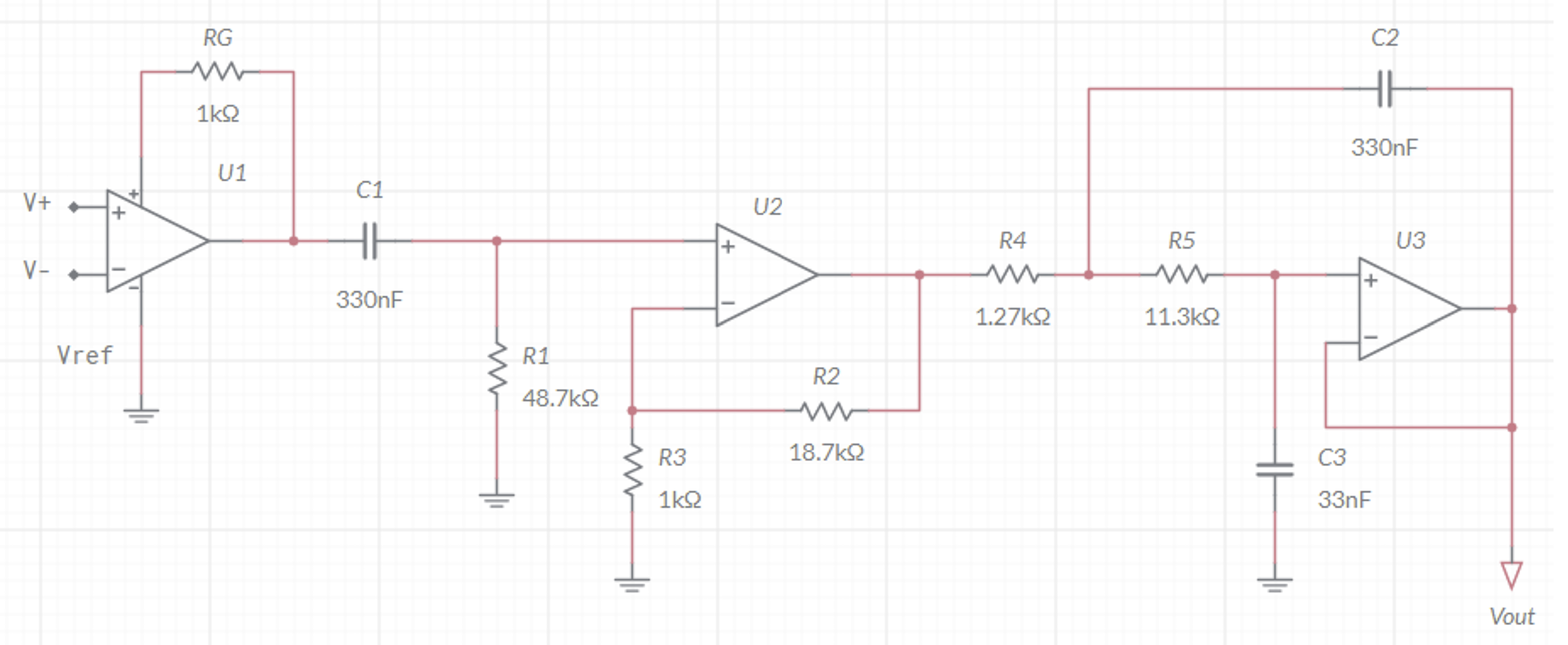 - Differential amplification with total gain of 1000