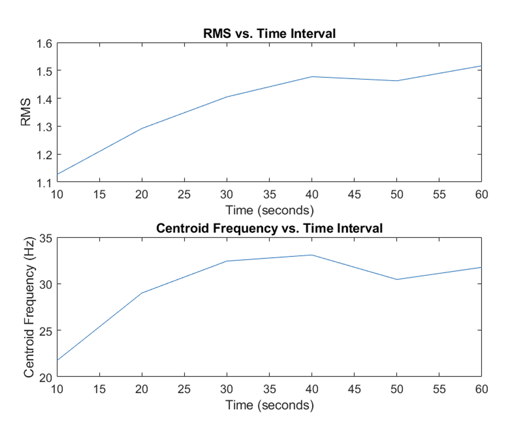 Both RMS and centroid frequency increased during the first 40 seconds of sustained contraction before plateauing, indicating progressive muscle fatigue as more motor units were recruited to maintain constant force.