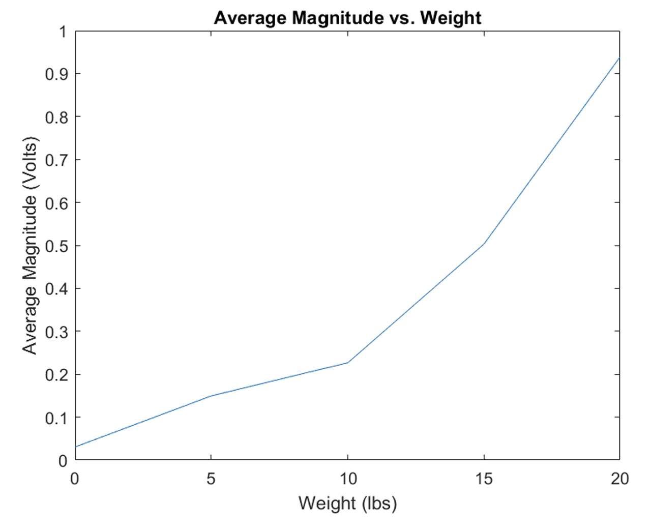The average magnitude vs. weight graph shows a positive relationship, which is expected. As the muscle tries to support more weight, there will be more electrical activity within the muscle.
