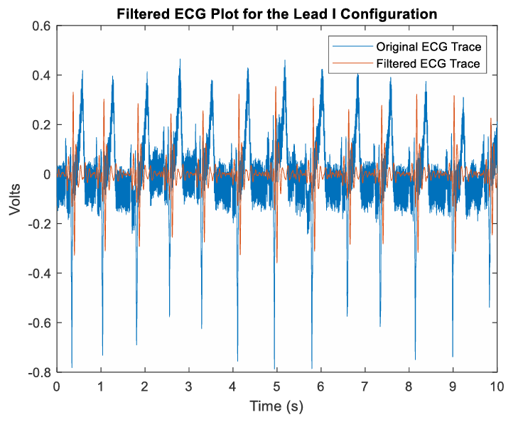 Output graph of signal after filtering with a 6th order bandpass filter using MATLAB's fdesign.bandpass function. The ECG traces are much more visible, with less noise impacting the signal.