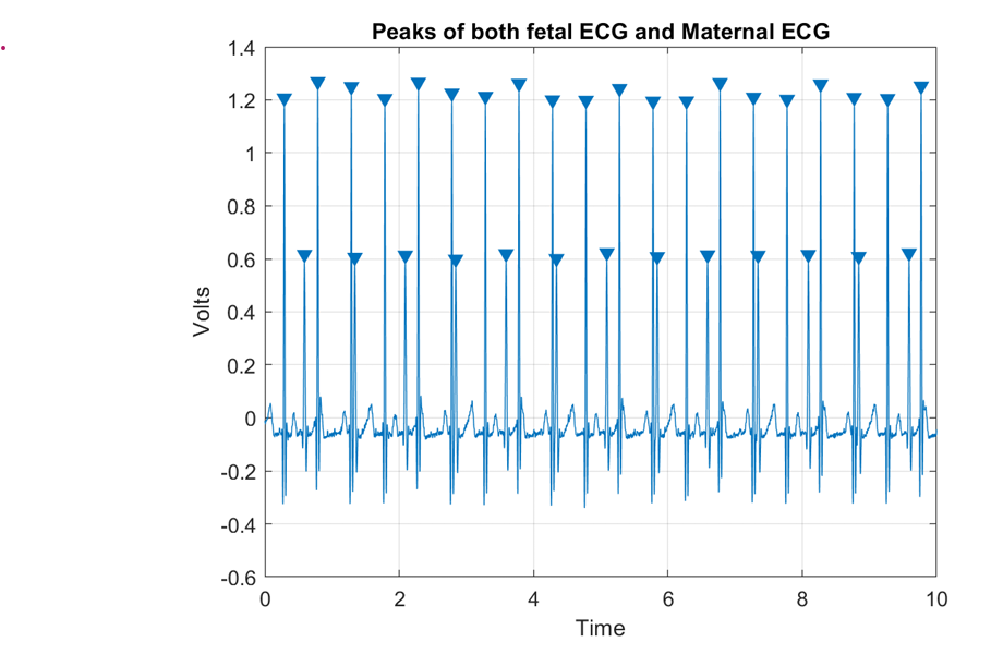 Simulated patient ECG of a pregnant person with both fetal and maternal signal. MATLAB's findpeaks function was used to find the number of local maxima and calculate fetal heart rate (120bpm) and maternal heart rate (78bpm).