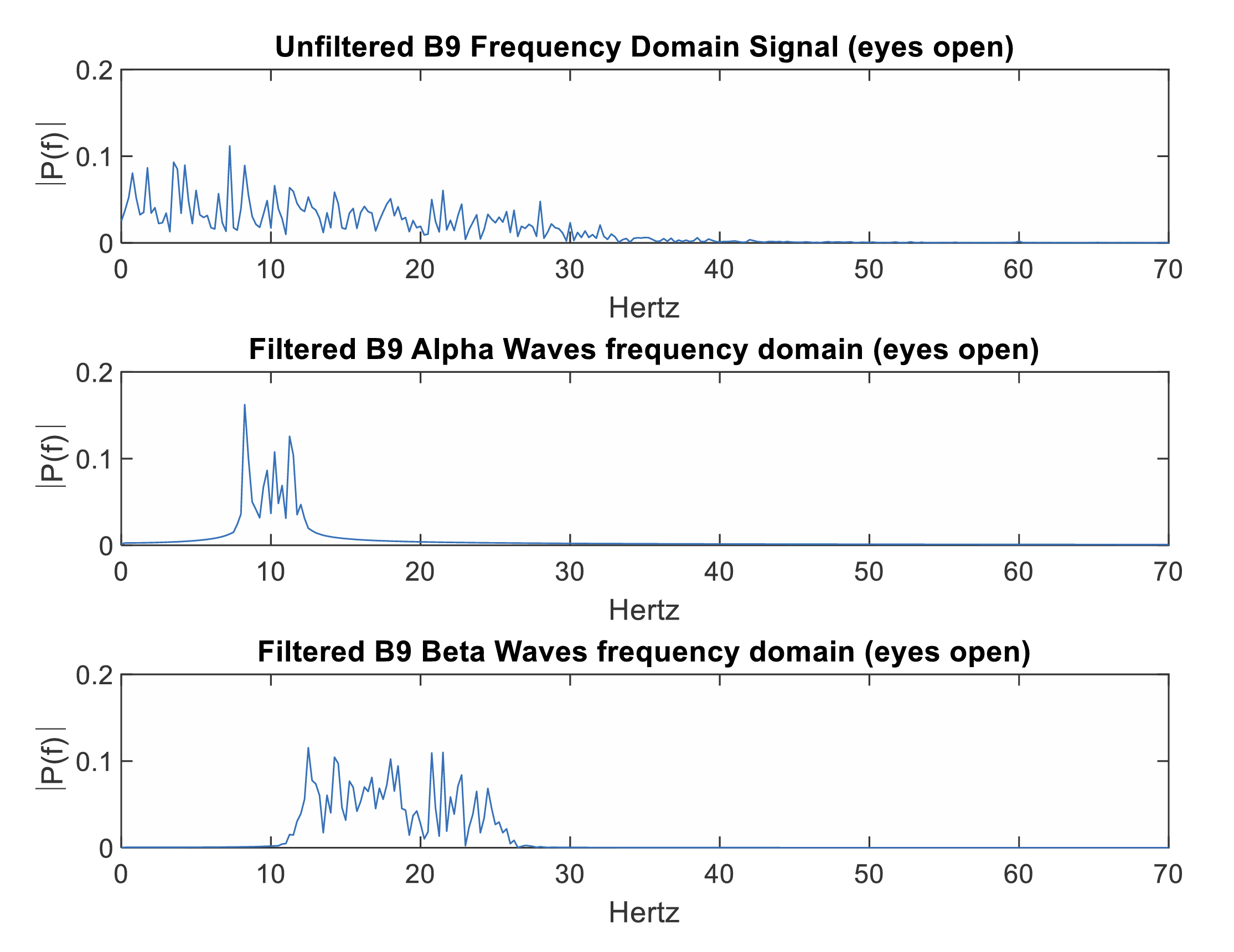 - Separated alpha waves (8-12 Hz) and beta waves (12-30 Hz) using 30th order Butterworth bandpass filters