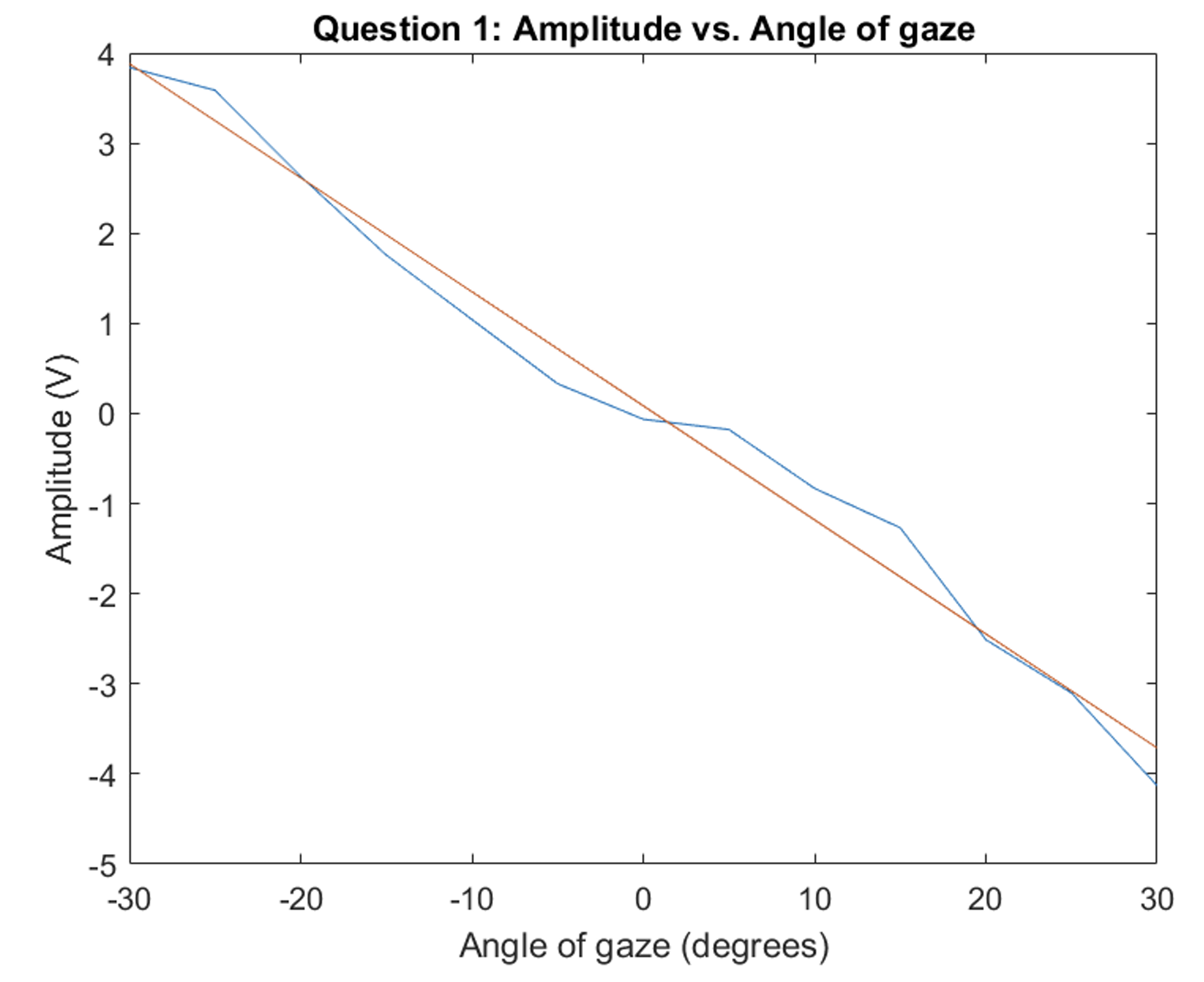 Amplitude response as a function of gaze angle (blue) and linear regression model (red). Linear regression was model equation is V = -0.12656θ + 0.085 (R² = 0.984), where V is the amplitude in volts and 𝜃 is the angle in degrees.